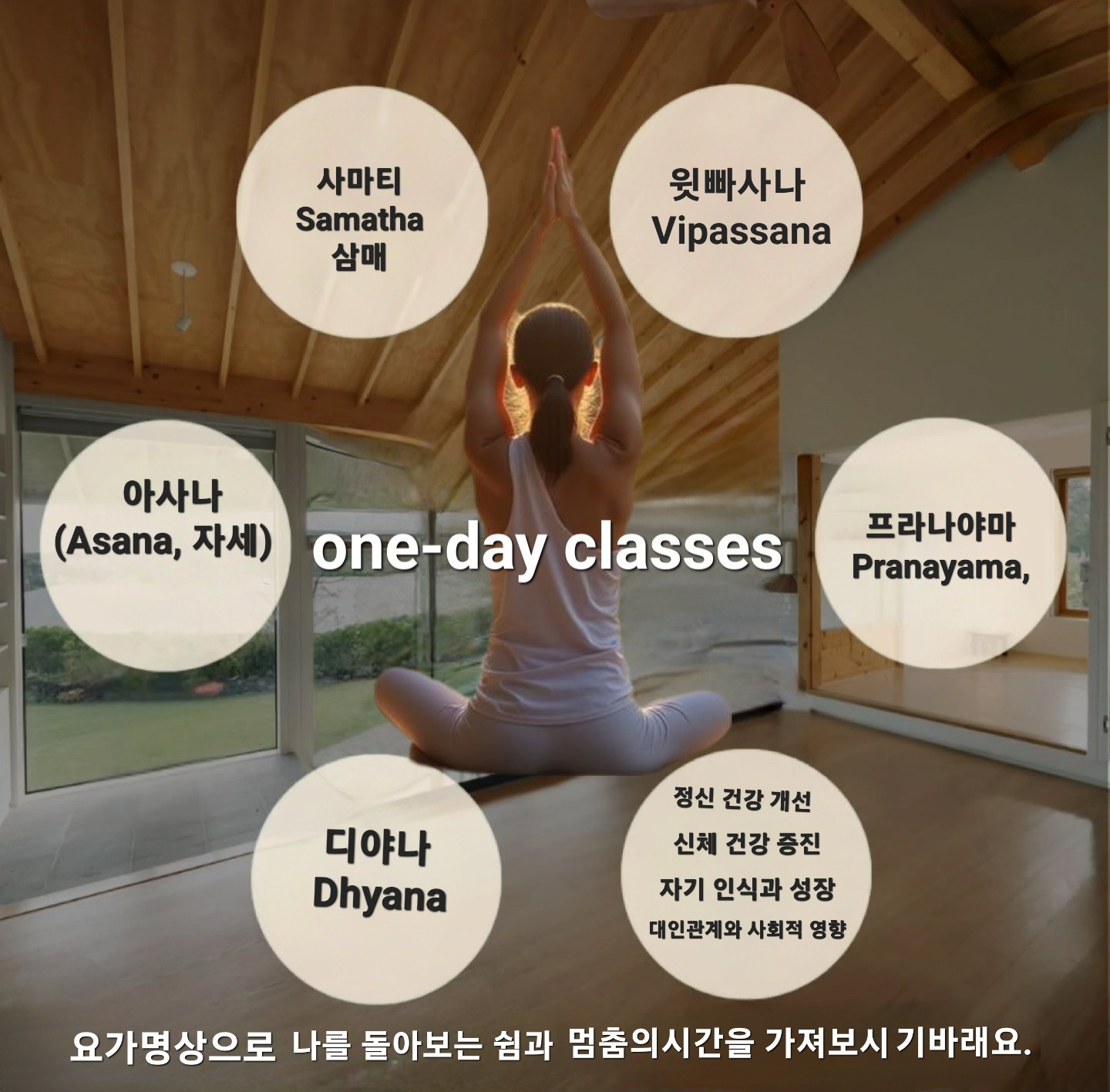 요가명상은 몸과 마음의 연결을 느끼게 하여 스트레스 해소, 정신 집중력 향상, 감정 안정, 자기 이해를 돕습니다.